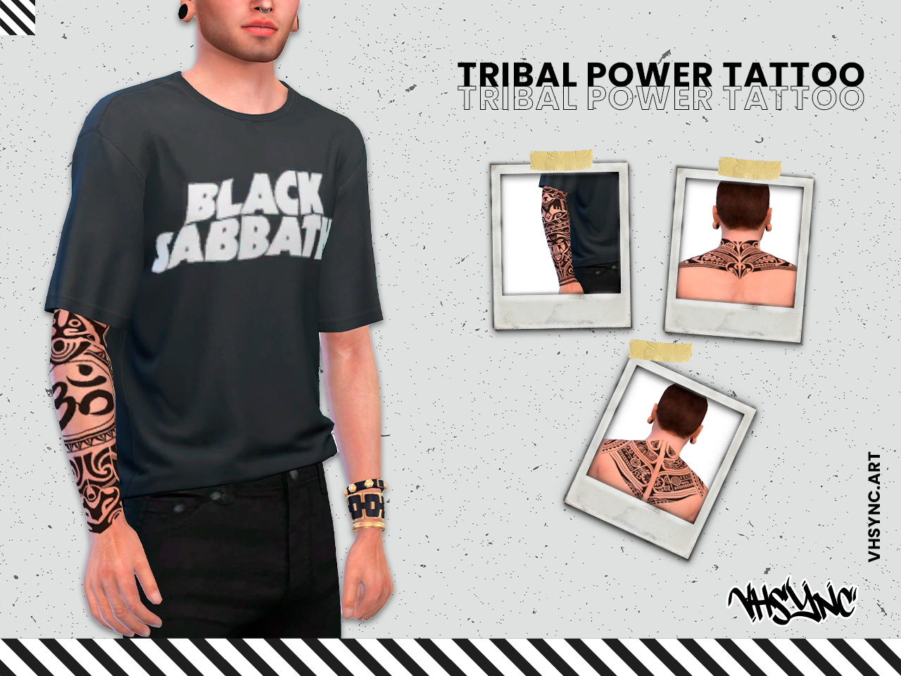 Este tatuaje tribal es perfecto para darle carácter a tus Sims en Los Sims 4. Diseñado en color negro, cubre los antebrazos y la parte superior de la espalda con un estilo tribal clásico que destaca por su simetría y detalles marcados.