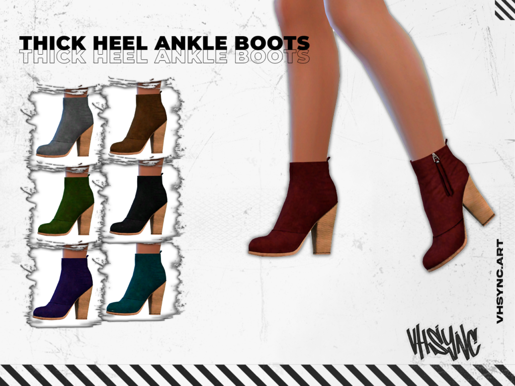 Estos botines de tacón grueso (thick heel ankle boots) son el complemento perfecto para añadir estilo y personalidad a tus sims. Diseñados con un acabado moderno y elegante, destacan por su estructura sólida y un tacón cómodo que combina tanto con outfits casuales como más formales.